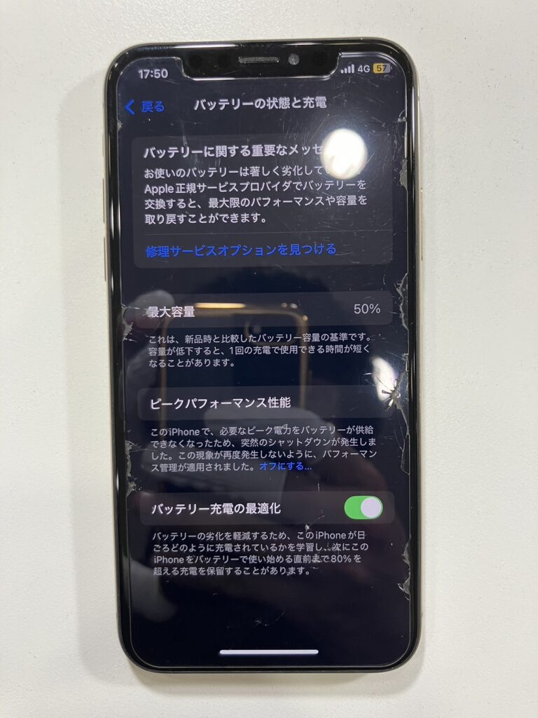 事前のヒアリングでバッテリー残量の減りがかなり早いことにお悩みのご様子でしたので、iPhoneの設定アプリでバッテリーの状態を確認すると最大容量が50%であることが分かりました。