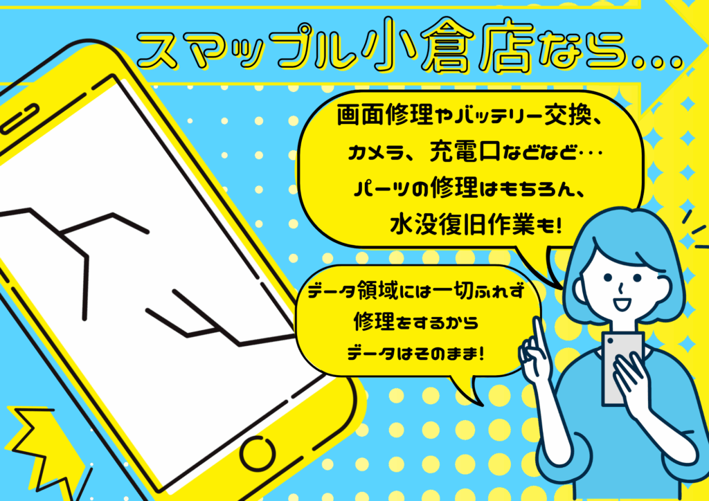 iPhone修理 買取 スマップル北九州小倉店では、バックアップや初期化など修理前の事前準備は一切不要!修理中はデータ領域に一切触れずに修理を行いますので、修理後も内部データはそのままでご利用頂けます!画面割れやカメラ修理はもちろん、バッテリー交換、背面ガラス修理、電源がつかなくなった、水に落としてしまったなど幅広くご対応いたします。