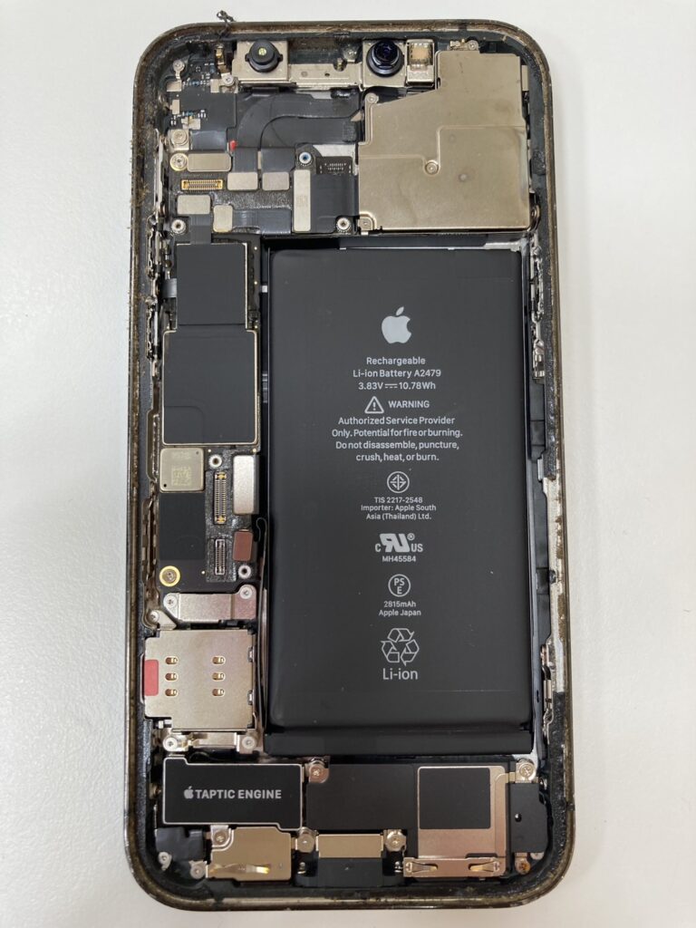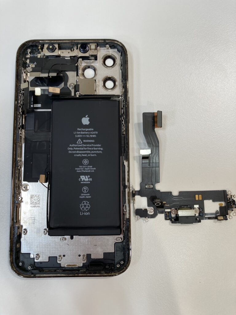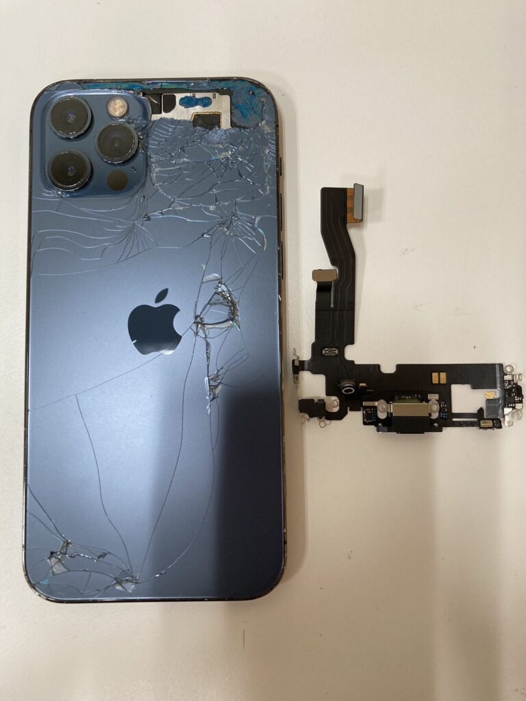 背面ガラスが大きく割れてなくなっているので、その部分から一気に水分が浸入したようです。再起動してしまう原因は、ドックコネクター(充電口)にありました。新しいドックコネクターに交換することで、再起動の症状がおさまりデータ移行が可能な状態に復旧しました。