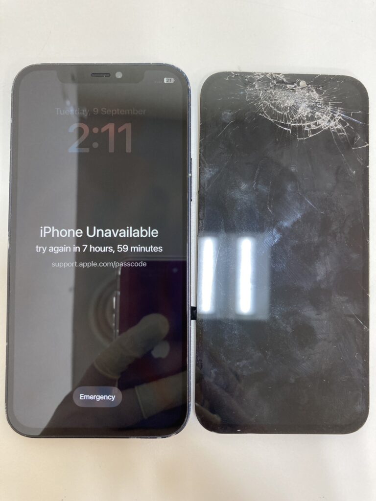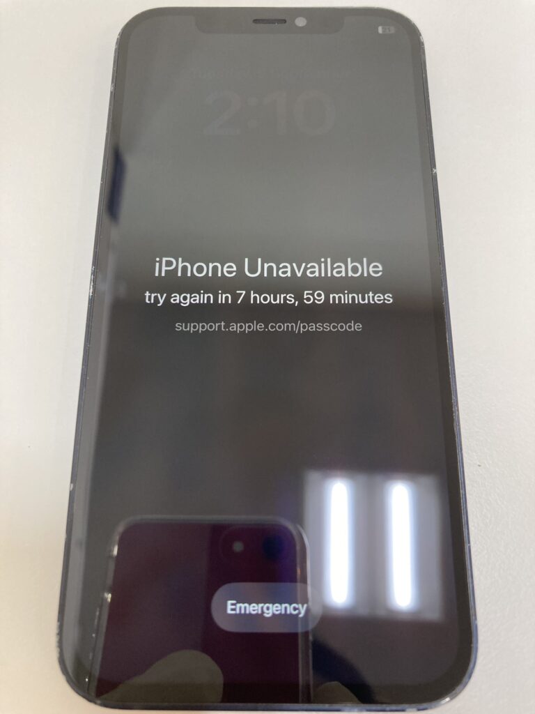 「iPhone Unavailable try again in 8 hours」iPhone 12が故障。データを守るためにはお早めに修理を。