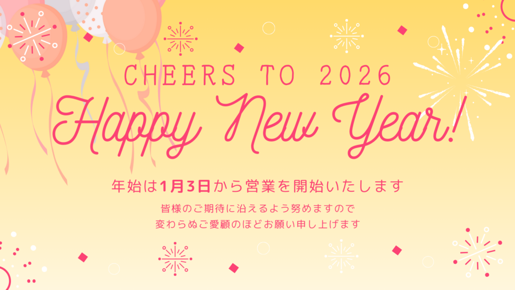 あけましておめでとうございます!本年も変わらぬご愛顧のほどよろしくお願い申し上げます。年始の営業開始は1月3日(土)10時00分からになります。お客様にはご不便をおかけいたしますが、何卒ご理解賜りますようお願い申し上げま …投稿日:2026-01-01