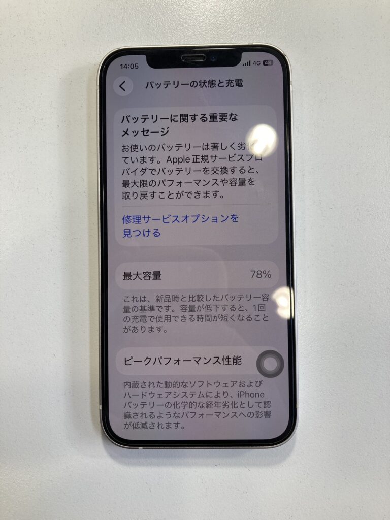 バッテリーの減りが早いことにお悩みでご来店され、バッテリーの最大容量を確認すると78%でした。バッテリーの最大容量が80%を下回ると、iPhoneの設定アプリの内のバッテリーの項目に劣化が進んでいることを示すメッセージが表示されるようになります。今回お持ち込み頂いたiPhoneもそのメッセージが出ていたので、劣化が進んでいることが考えられます。