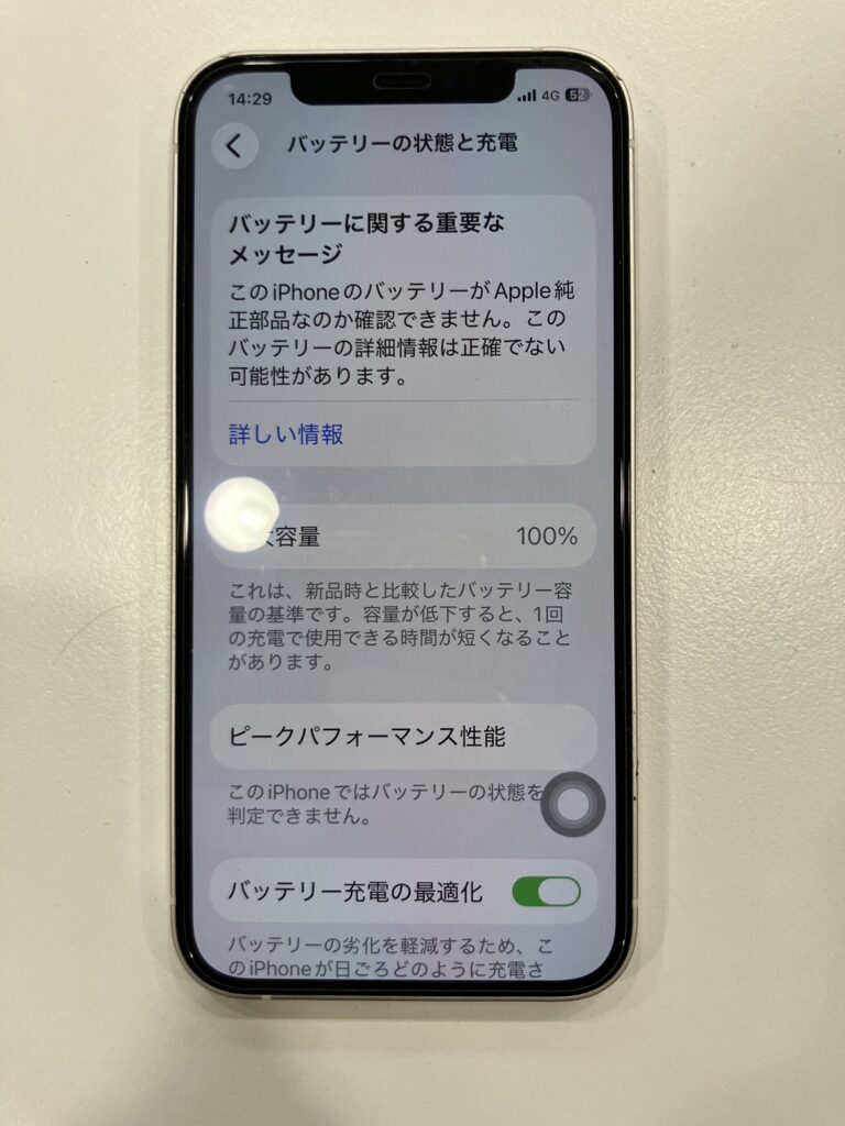 スマップルは民間の修理店ですので、Apple純正パーツではなく互換パーツを使用して修理を行います。また、Apple正規店の修理過程とは異なった手順・方法で修理を行っているので、Apple正規店で修理を行うと出てこないような”不明な部品”や”修理”といった表示が出てくるようになります。表示を出さないようにするには本体とバッテリーをペアリングする必要があり、データを消さないとペアリングが完了しないこともあります。