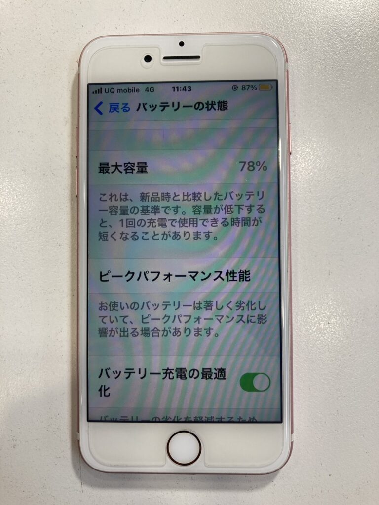 最近減りが早く感じてすごいスピードで減っていくことがあるのでバッテリーを交換したいとの事でお持ち込み頂きました。バッテリーの最大容量を確認すると78%でした。バッテリーの交換目安は80%前後と言われているので、適切なタイミングだと思います。